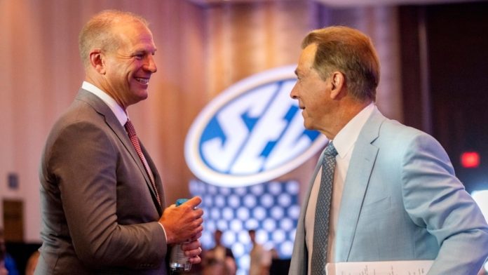 Former Alabama head football coach Nick Saban, left, and current Alabama coach Kalen DeBoer greet each other after appearing on the set of ESPN’s SEC Now during the Southeastern Conference NCAA college football media days Wednesday, July 17, 2024, in Dallas. (AP Photo/Jeffrey McWhorter)AP