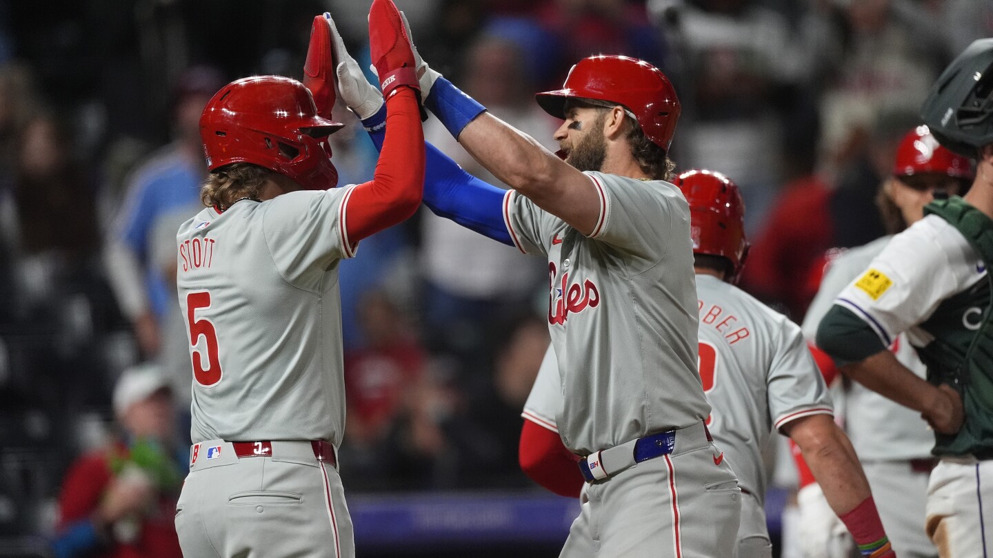 DENVER (AP) — Bryce Harper hit a three-run homer in Philadelphia’s six-run ninth inning and the Phillies rallied past the Colorado Rockies 8-4 on Saturday night for their seventh win in eight games.