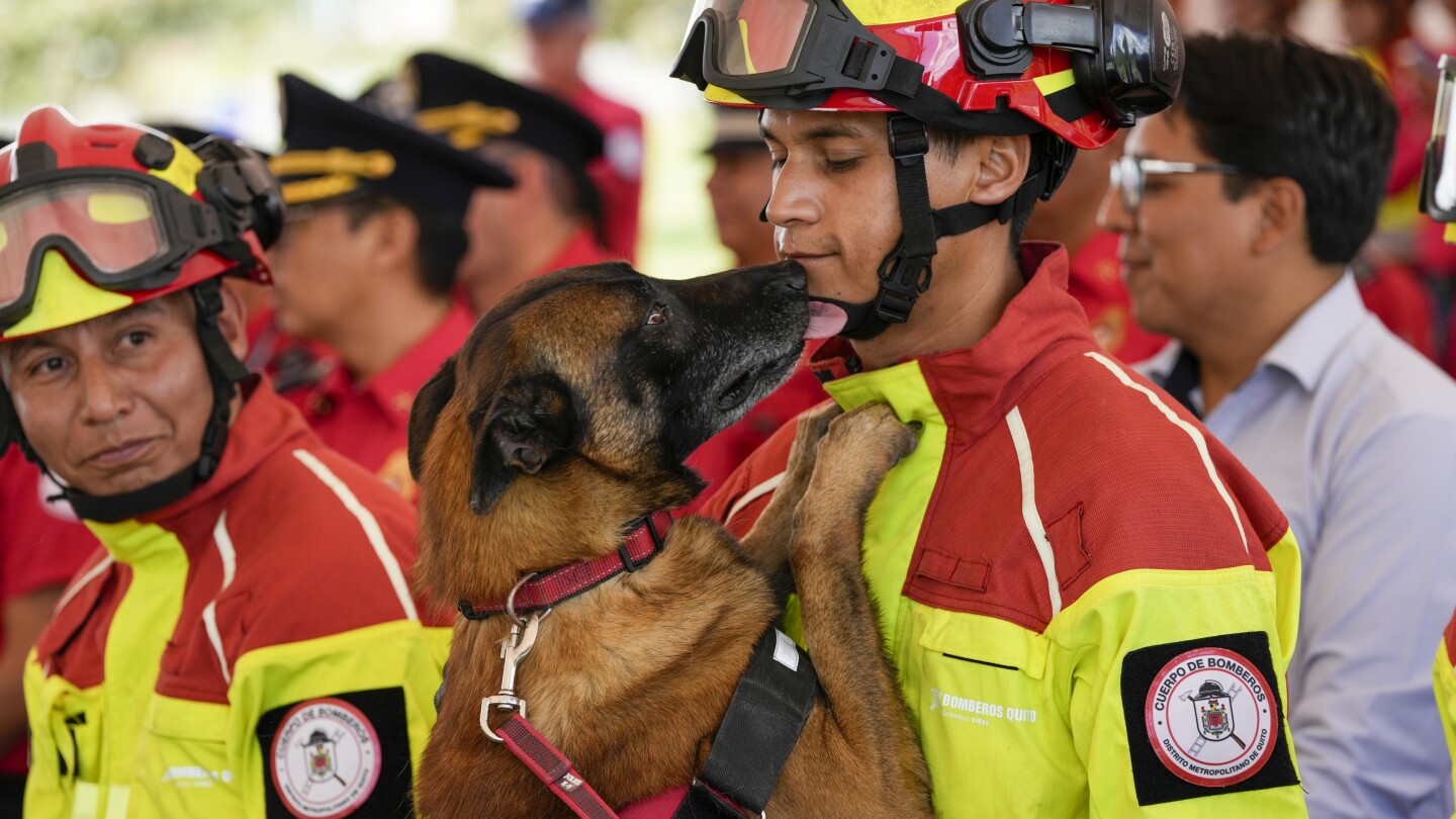 QUITO, Ecuador (AP) — Five rescue dogs were honored by Ecuador’s Fire Department on Monday at a ceremony formally retiring them after seven years of service and turning them over to new adoptive owners.