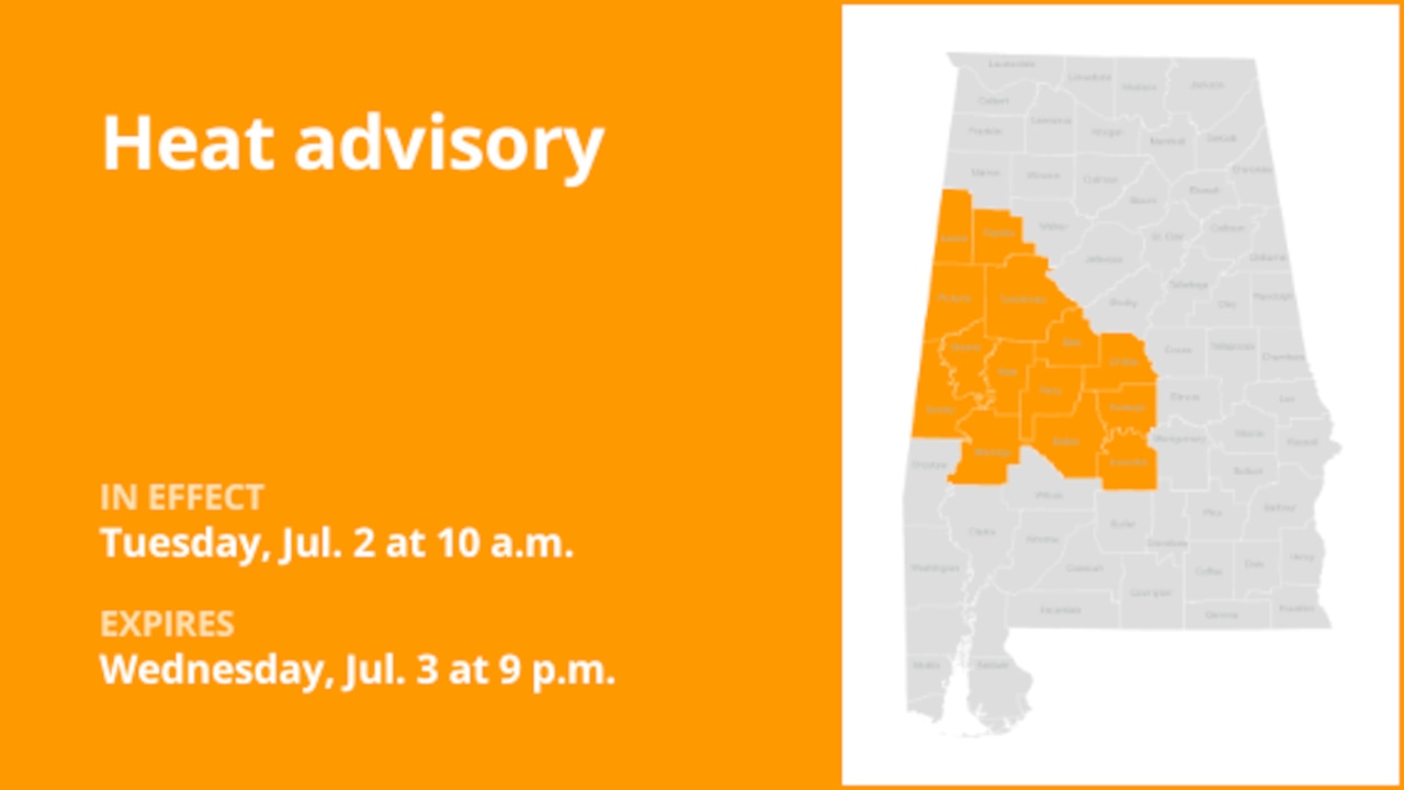 A heat advisory was issued by the National Weather Service on Tuesday at 1:13 a.m. valid from 10 a.m. until Wednesday 9 p.m. for Lamar, Fayette, Pickens, Tuscaloosa, Sumter, Greene, Hale, Perry, Bibb, Chilton, Marengo, Dallas, Autauga and Lowndes counties.