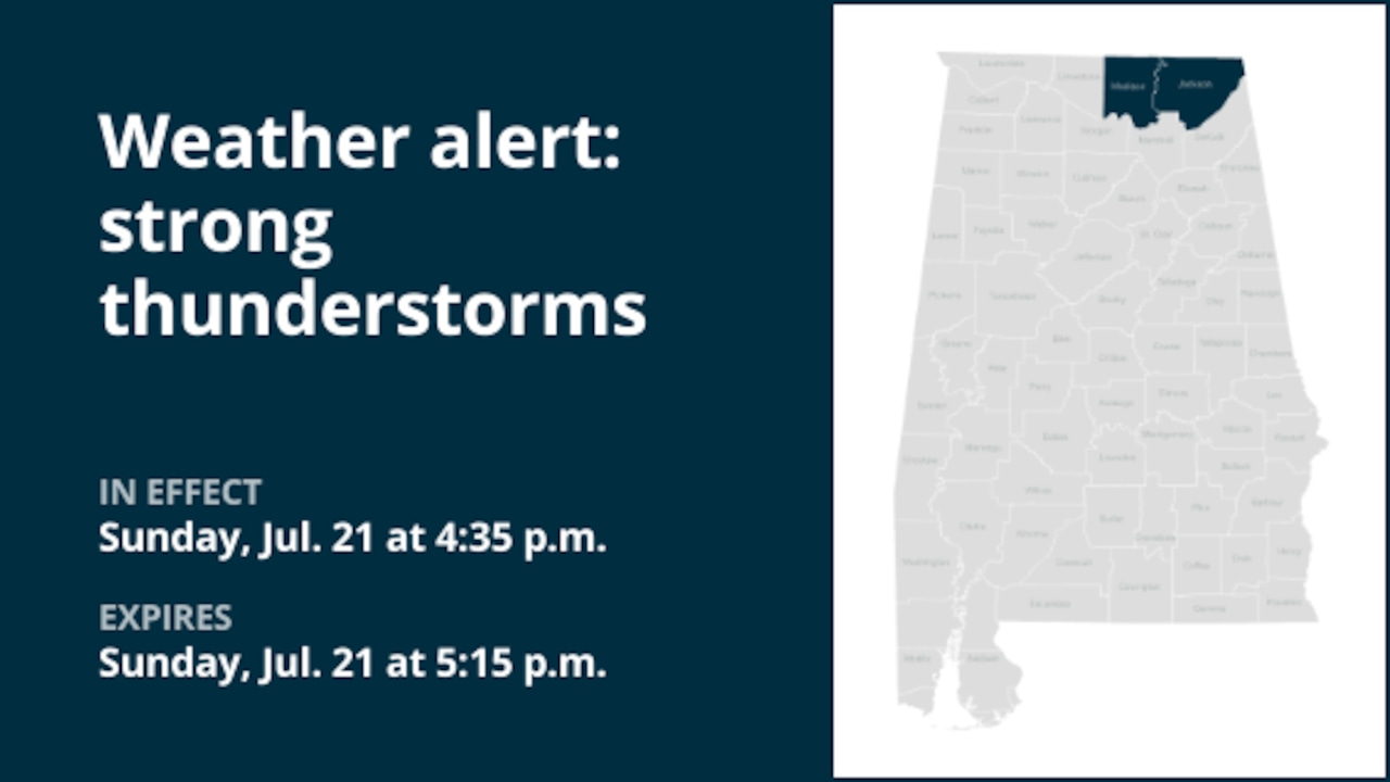 The National Weather Service issued a report at 4:35 p.m. on Sunday for strong thunderstorms until 5:15 p.m. for Madison and Jackson counties.