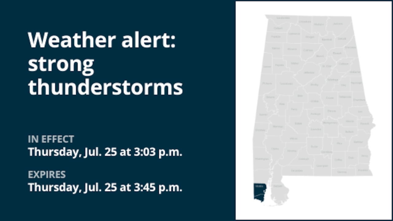 A report was issued from the National Weather Service on Thursday at 3:03 p.m. for strong thunderstorms until 3:45 p.m. for Mobile County.