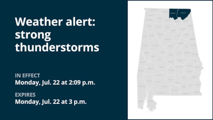 The National Weather Service issued a report at 2:09 p.m. on Monday for strong thunderstorms until 3 p.m. for Madison and Jackson counties.