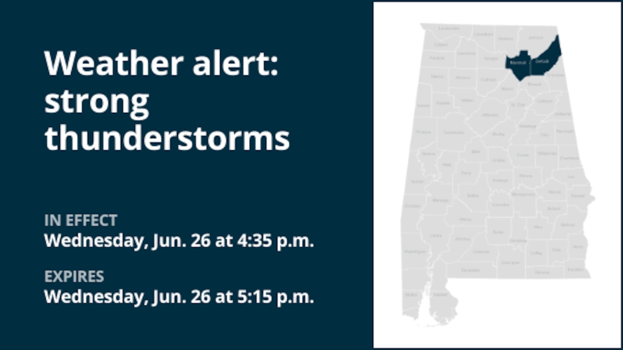 The National Weather Service issued a weather alert at 4:35 p.m. on Wednesday for strong thunderstorms until 5:15 p.m. for Marshall and DeKalb counties.