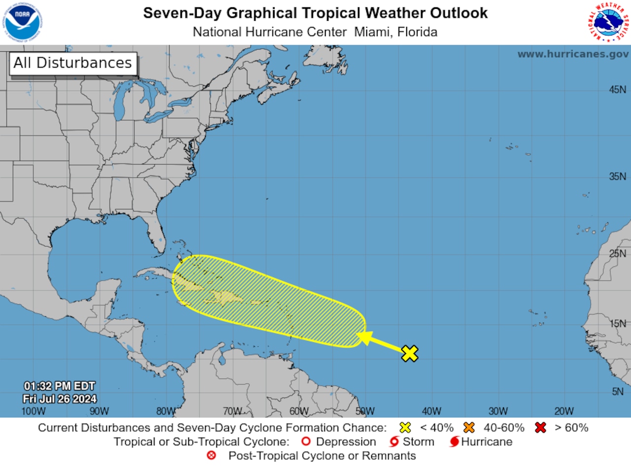 Right now the area to watch has a low chance of development. But if it did begin to organize the expected track would be of concern to those in the Caribbean — and potentially the United States.